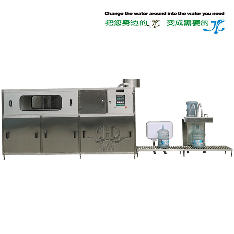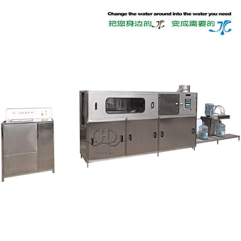 The empty barrel is input into the capping machine stably by the conveyor belt. The cover pulling machine is used to pull out the cover, which can be reused after cleaning and disinfection. Then the barrel goes into the external brush barrel machine for all-round brushing. After comprehensive external cleaning, the bottles enter the washing, filling and capping unit, and the purified water is provided by the water treatment system for washing and filling the barrels. After capping, the bottled water enters the heat shrinker through the conveyor belt. The shrink film packaging of bottle cap is completed in the heat shrinkable machine. The whole production process is controlled by PLC. The control panel can directly monitor the working state of each part of the equipment, and is easy to operate.