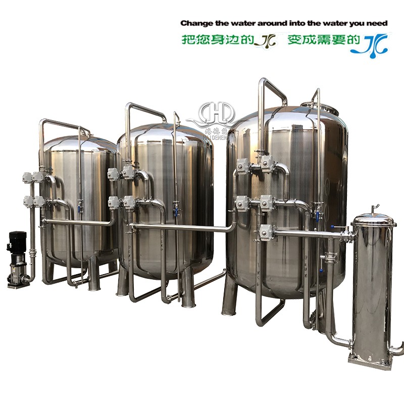 活性炭具有较强的吸附过滤性能,对水中的余氯、异色、异味、有机物等具有较强的吸附作用。由于反渗透膜对余氯、有机物十分敏感,所以必须配置活性炭吸附余氯、有机物,使出水余氯≤0.1mg/L,SDI≤4,第一可以满足反渗透膜的给水要求。第二可大大的提高源水的原有的口感.可随时通过多路控制阀或汽动蝶阀进行反洗,以冲洗掉其表面的胶体等污染物,防止活性炭表面被杂质包围起不到吸附作用,并防止其堵塞,恢复其处理能力。