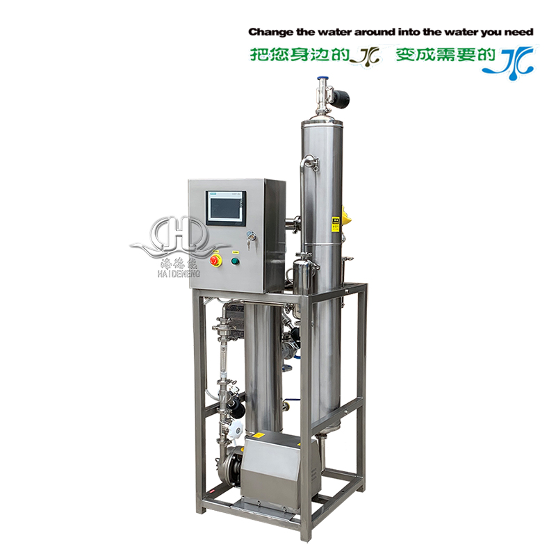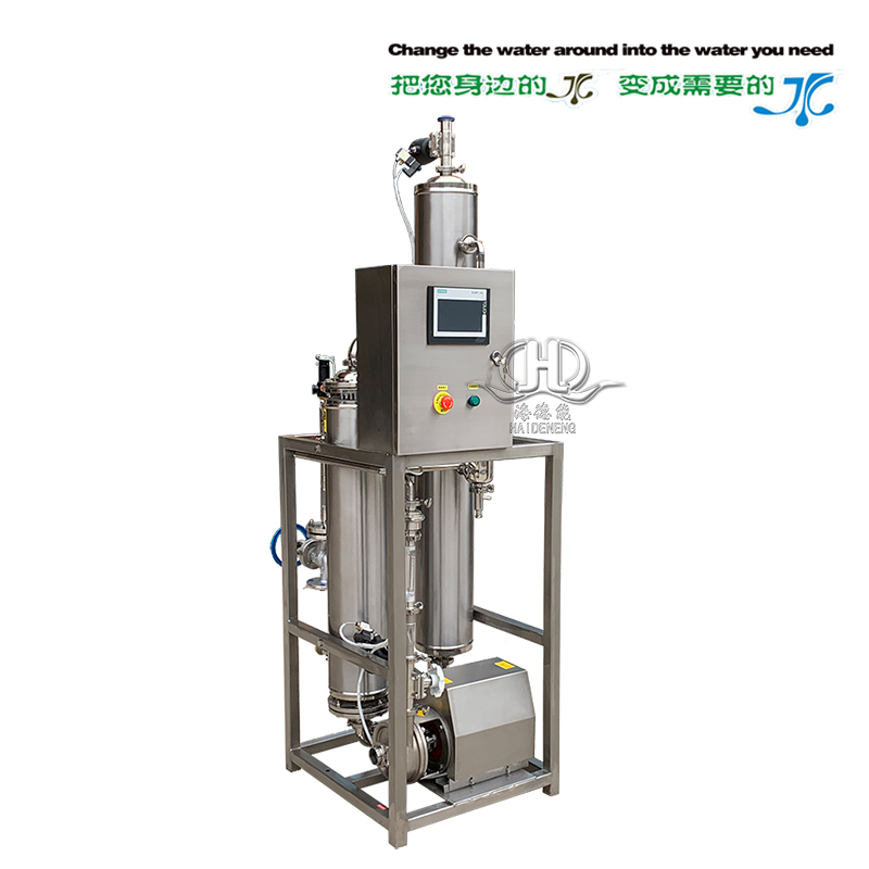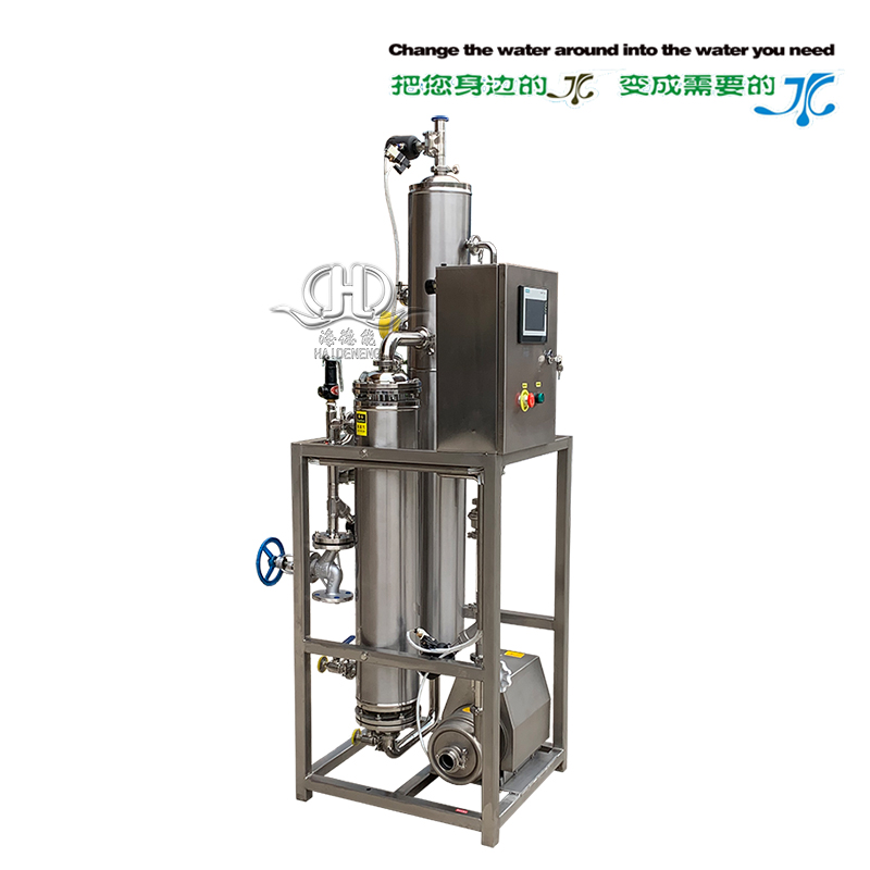 9323彩票集团原料水通过一个进料泵输送到除污染柱体和热交换器的管子一侧,液位由液位计控制。工业蒸汽或者加热水进入到热交换器后,将原料水加热到蒸发温度,并在两个柱体内部形成了强烈的热循环。纯蒸汽就会在蒸发器(除污染柱)中产生。蒸汽的低速和柱体的高度在重力作用下将会去除任何可能不纯净的小水滴。通过一个气动调节器调节工业蒸汽进汽阀门的开启度,纯蒸汽压力可以恒定维持在用户设定的压力值,范围在0-3bar之间。